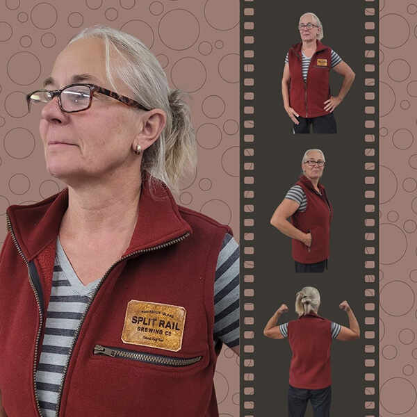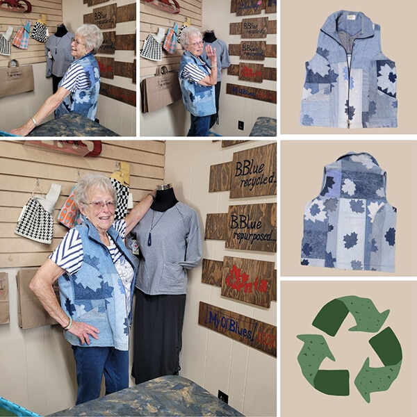 Donna Law popped in early September sporting her Maple Leaf Patchwork Recycled Denim Vest.