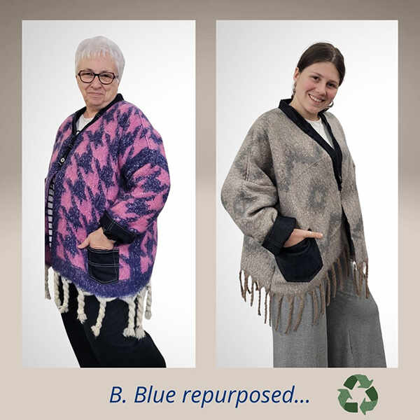 This summer we created Blanket Jackets using the pockets, waistbands, and legs from our "huge stash" of denim jeans and pairing up with 2 large scarves.